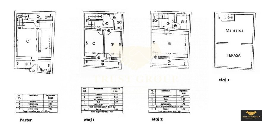 Compartimentare: living si bucatarie openspace, 3 dormitoare, bucătărie, 3 băi