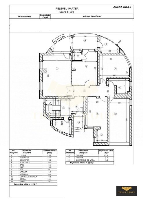 Parter - vestibul, living, doua dormitoare, bucatarie, debara, doua bai, camera tehnica, garaj si o terasa in supratata de 115 mp.